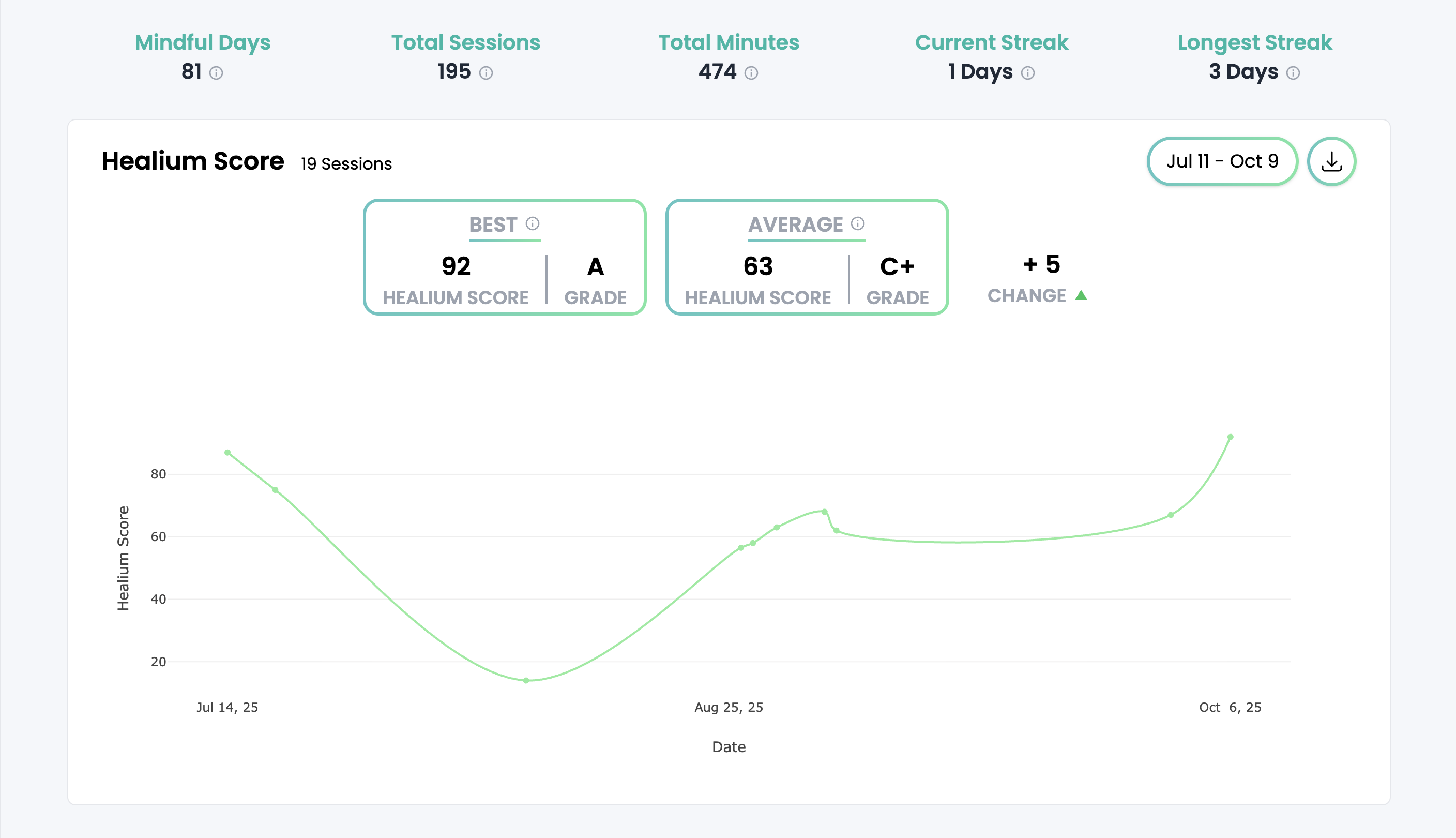This section shows you your Best and Average Healium Scores over the selected period of time. It also shows a line graph of how your Healium Score changed over that same period.