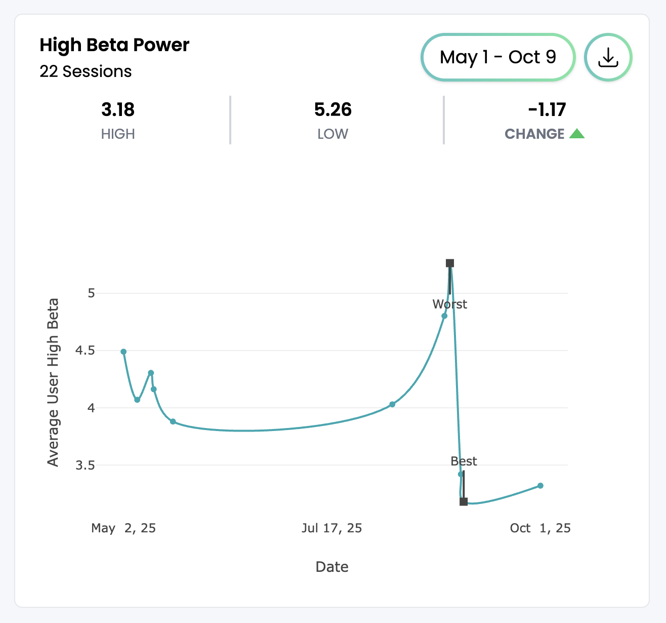 This section shows your average High Beta brainwave amplitude during Healium sessions (only applies to sessions when you were wearing a compatible EEG headband, such as a Muse 2, during the Healium session).