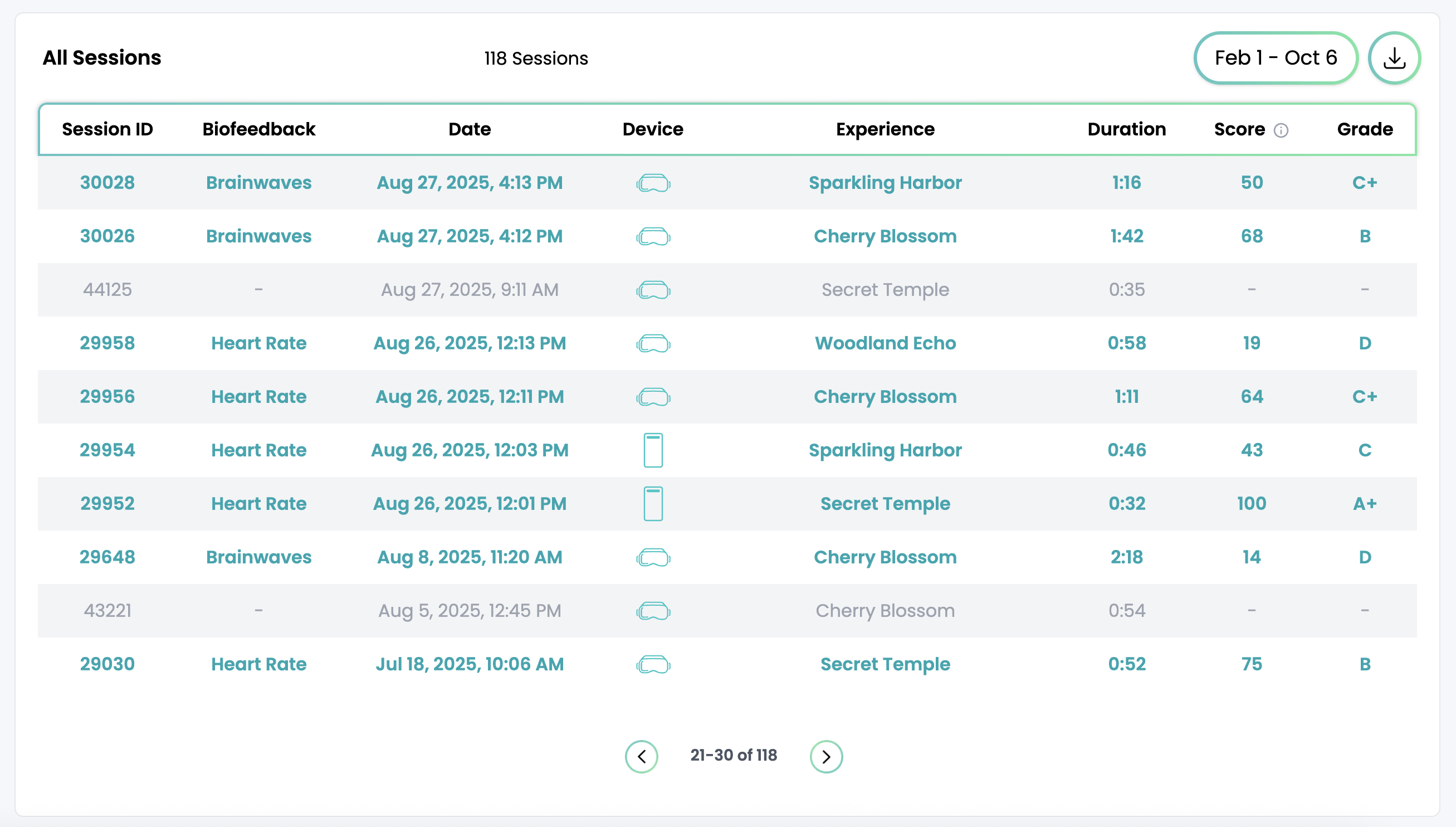 To see a particular session's brainwave or heart rate data, simply click on that session.