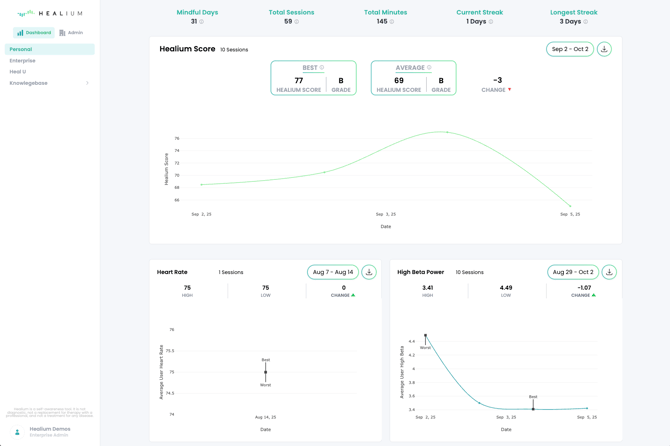 The Enterprise Tab is similar to the Personal tab, but it will show you aggregate data of your Enterprise's Healium usage, including average Healium score across all sessions, as well as individual session data.